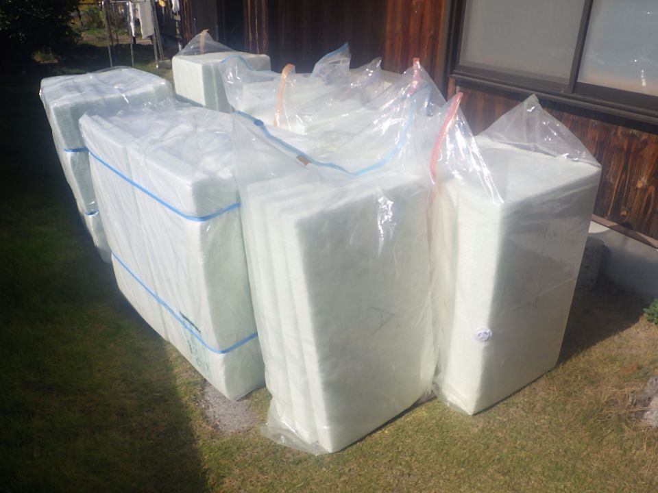それが済めばあとは各場所のサイズに合わせプレカットした断熱材を大引き間にはめ込みタッカー(ホッチキスの大型)で固定していきます